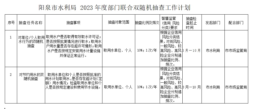 阳泉市水利局 2023年度部门联合双随机抽查工作计划