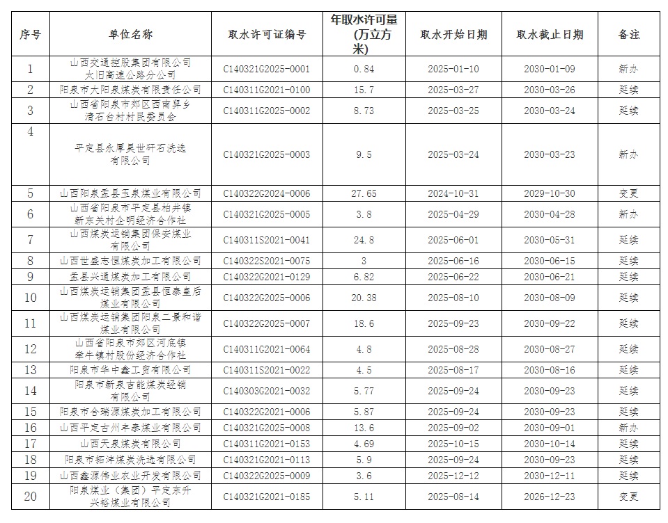 2025年新发或延续、变更的取水许可证公告如下: